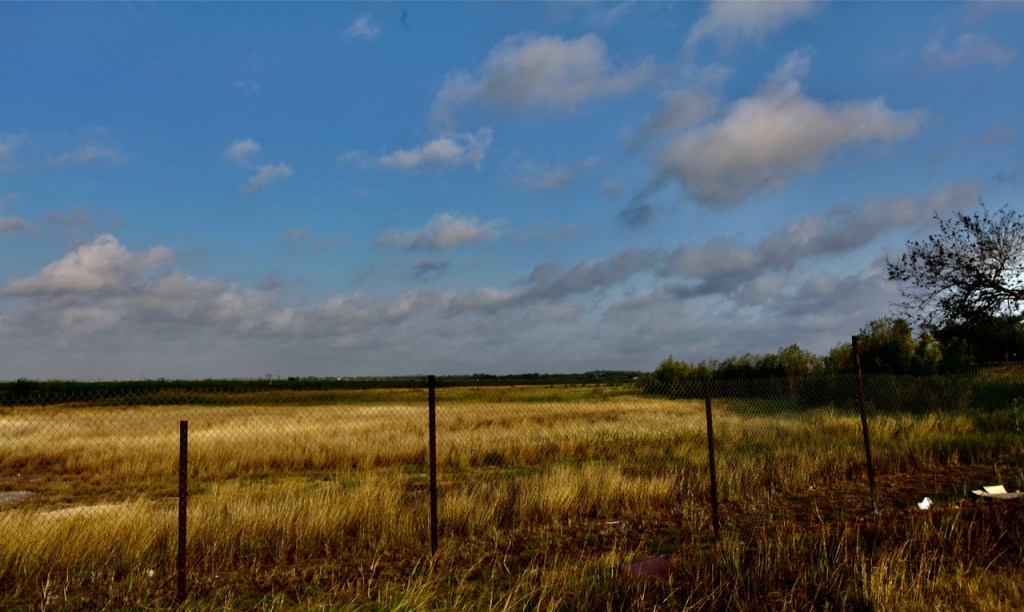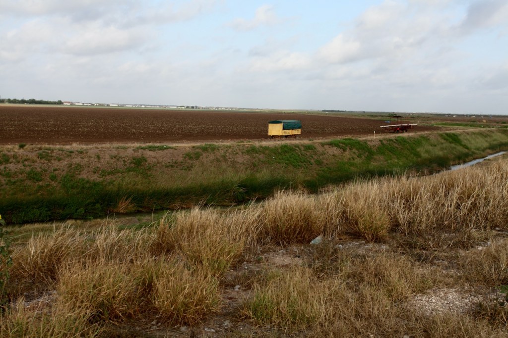 A panoramic view, overlooking the southern part of Pharr, Texas, towards the U.S/Mexico border, reveals a magnificent landscape of milpas, stretched out in rows of planted crops and open skies. Some of these fields are tended by small groups of people, perhaps families, intensely laboring over the harvested produce. These fields were in abundance decades ago, but urban encroachment has steadily diminished a great deal of what used to exist in both lifestyle and livelihood. The Rio Grande River (also known as el Río Bravo), which serves as the two-country boundary, provides the water that sustains the fertile banks and irrigation canals.
